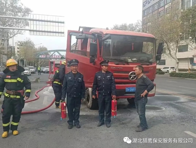 面對突如其來的變故,貨車司機緊急停車,下來時由于過度緊張,以至于重重摔倒在地,當時司機疼痛難忍,更不知何滅火。危急關頭,我公司駐荊楚理工學院東門的保安員金鵬程(男,55歲,中共黨員,荊門城區(qū)人)和趙兵(男,55歲,漳河新區(qū)人)發(fā)現(xiàn)險情后,迅速從值班室提起滅火器沖向著火的貨車,一左一右對準起火部位進行噴射滅火。