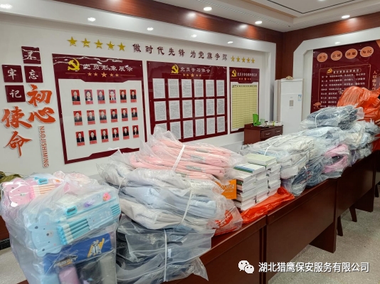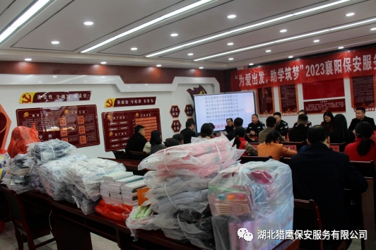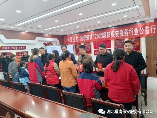 2023年11月24日在襄陽市公安局保安監(jiān)管大隊的帶領(lǐng)下,湖北獵鷹保安服務(wù)有限公司聯(lián)合襄陽其他保安服務(wù)行業(yè)一行7個單位走進保康縣店埡鎮(zhèn)兩所學(xué)校,為貧困學(xué)生送去了資助金和一批書籍、文具、書包等物資。